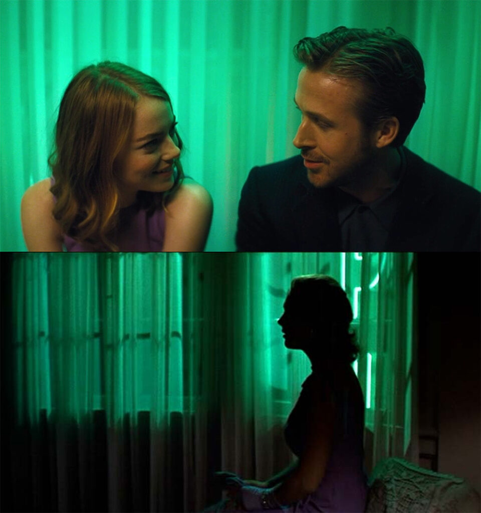 La photographie signée Linus Sandgren joue sur des palettes de couleurs très vives et souvent primaires (bleu, rouge ou jaune) invoquant les teintes saturées du technicolor. Par ailleurs, Damien Chazelle multiplie les références cinématographiques pour construire son film. L’œuvre la plus citée est sûrement Singin’ in the Rain de Stanley Donen sorti en 1952, une comédie musicale culte qui représente à merveille l’âge d’or du cinéma hollywoodien. La scène où l’on repère le plus de références est une des scènes emblématiques de La La Land (qui est d’ailleurs devenue l’affiche officielle du film). Le lampadaire sur lequel s’appuie Sebastian renvoie à la fameuse scène sous la pluie où Don, interprété par Gene Kelly, danse avec son parapluie. Mais la référence va encore plus loin puisque Damien Chazelle incorpore des sonorités de la chanson Singin’ in the Rain dans la séquence musicale A lovely Night. Cependant, Chazelle ne cite pas seulement des comédies musicales. Par exemple, dans le passage chanté de City of Stars, c’est avec l’éclairage vert que Chazelle fait référence au film Vertigo d’Alfred Hitchcock. On aperçoit également tout au long du film des affiches sur les murs comme dans la chambre de Mia où est représenté le portrait d’Elsa, un des personnages de Casablanca joué par Ingrid Bergman. Mia travaille dans un studio de tournage typique d’Hollywood, où elle touche son rêve du bout des doigts tous les jours. Se côtoient des décors de films culte avec d’autres encore en cours de production qui deviendront peut-être des classiques. Mia regarde les films se créer de manière émerveillée comme une enfant. On sent une part du réalisateur dans son personnage.